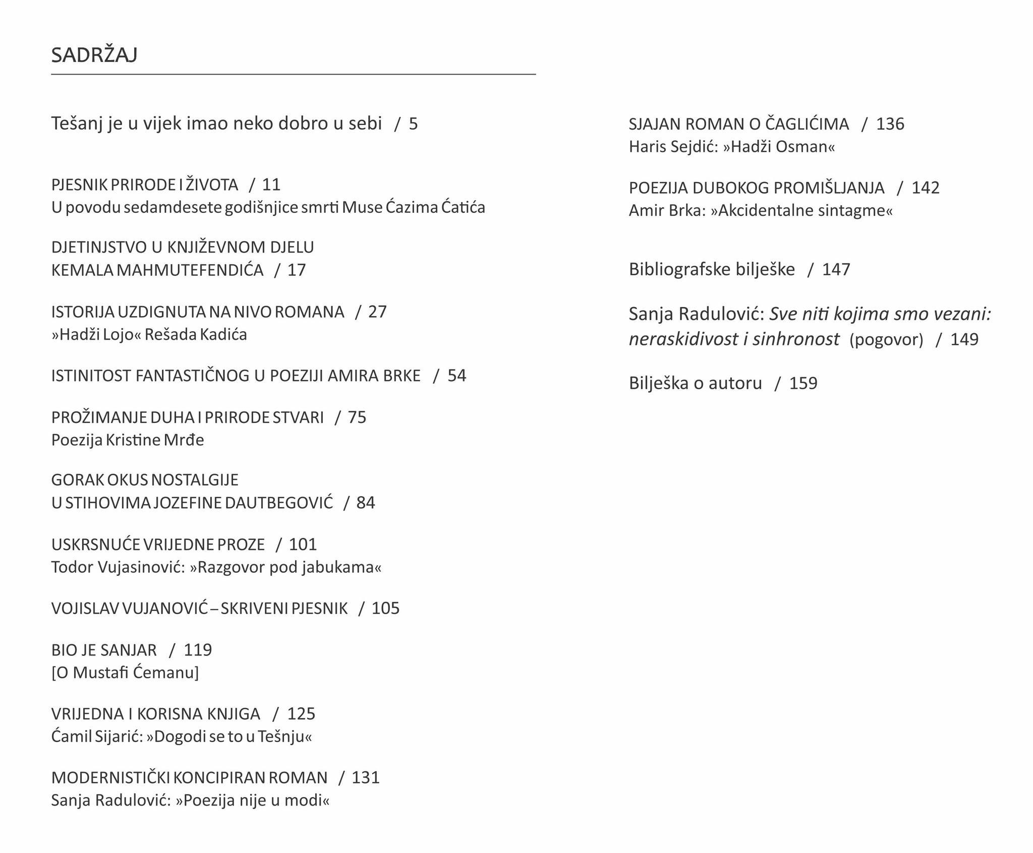 “U ovoj knjizi riječ je o stvaralaštvu književnika koji su rođeni u Tešnju ili o onima koji su ostavljali tragove u kulturi toga mjesta i kulturi i književnosti uopšte, a o kojima je Centar za kulturu i obrazovanje u Tešnju organizovao simpozijume i promocije, ili im je objavljivao knjige. Uvijek sam se rado odazivao na te manifestacije, jer je Centar dobar i odgovoran domaćin. S vremenom su mi se smanjile mogućnosti da se krećem i živio sam svakodnevnim, gotovo neaktivnim životom, pa su me pozivi na kulturne manifestacije iz Tešnja veoma radovali, jer sam se zbog njih osjećao još uvijek potrebnim. Radovi objedinjeni u ovoj knjizi plod su tih susreta.”